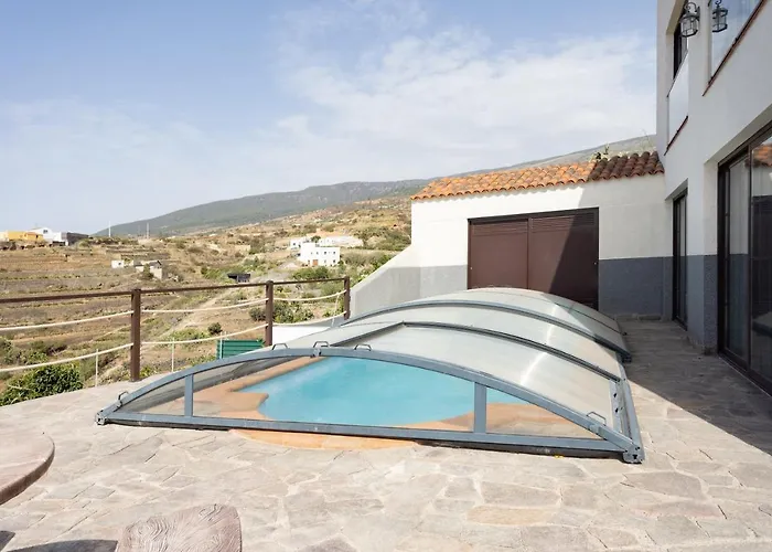 Es dauert 31 Minuten, um mit dem Auto zum Flughafen Teneriffa Süd zu fahren. Die Villa öffnet sich zu einer Terrasse und blickt auf den Garten.